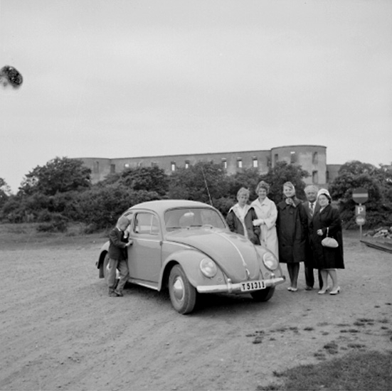 Sex personer vid bilen. Befästning i bakgrunden.