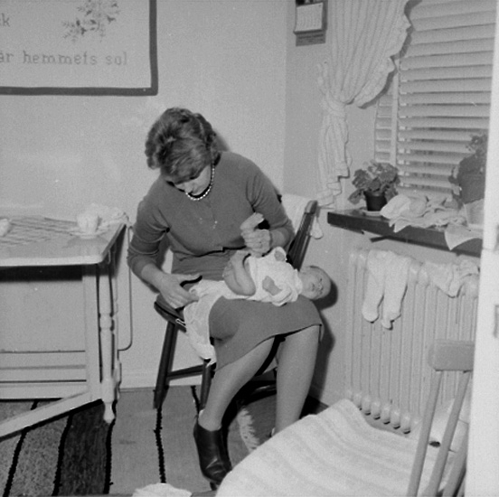Titel: Rumsinteriör, en kvinna och en liten pojke. Patrik och Plutt