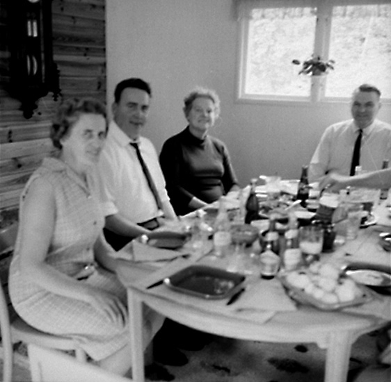 Rumsinteriör, fyra personer vid bordet. Kexens Personalklubb hos Eivor Johansson.