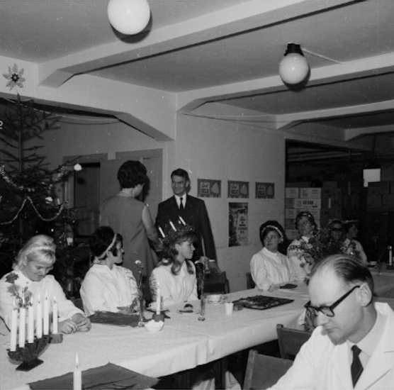 Titel: Rumsinteriör, grupp vid bordet, Luciafirande. Örebro Kexfabrik.