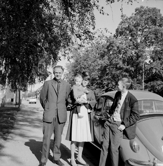 Familjegrupp fyra personer vid bilen.