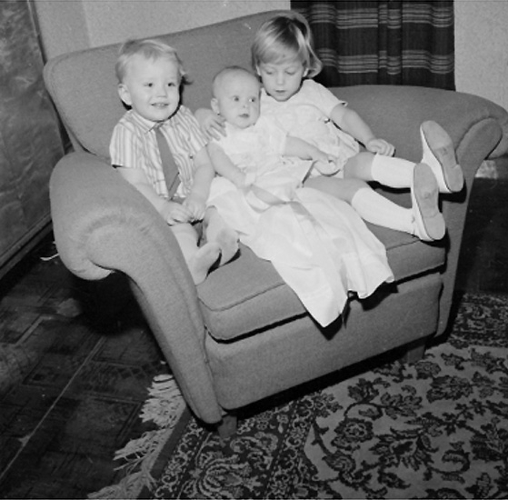 Titel: Rumsinteriör, tre barn. Barndop hos Axel och Brita.