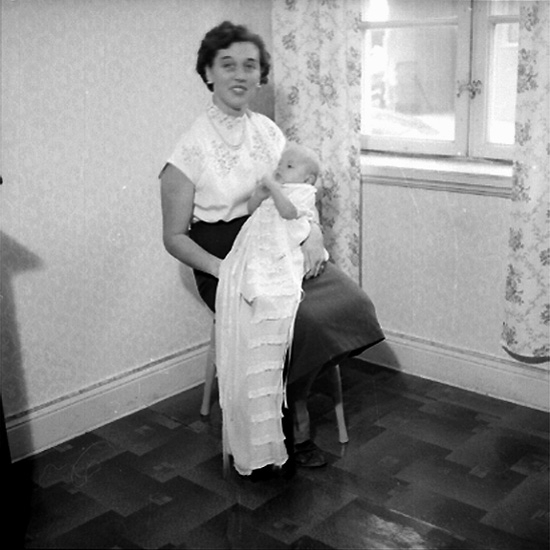 Titel: Rumsinteriör, barndop, en kvinna och en baby. Sven och Stina Andersson