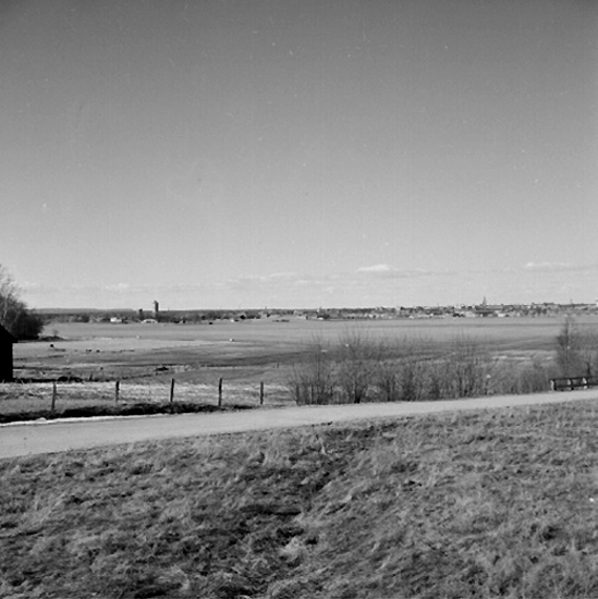 Titel: Vy. Åkermark i förgrunden, byggnader i bakgrunden.