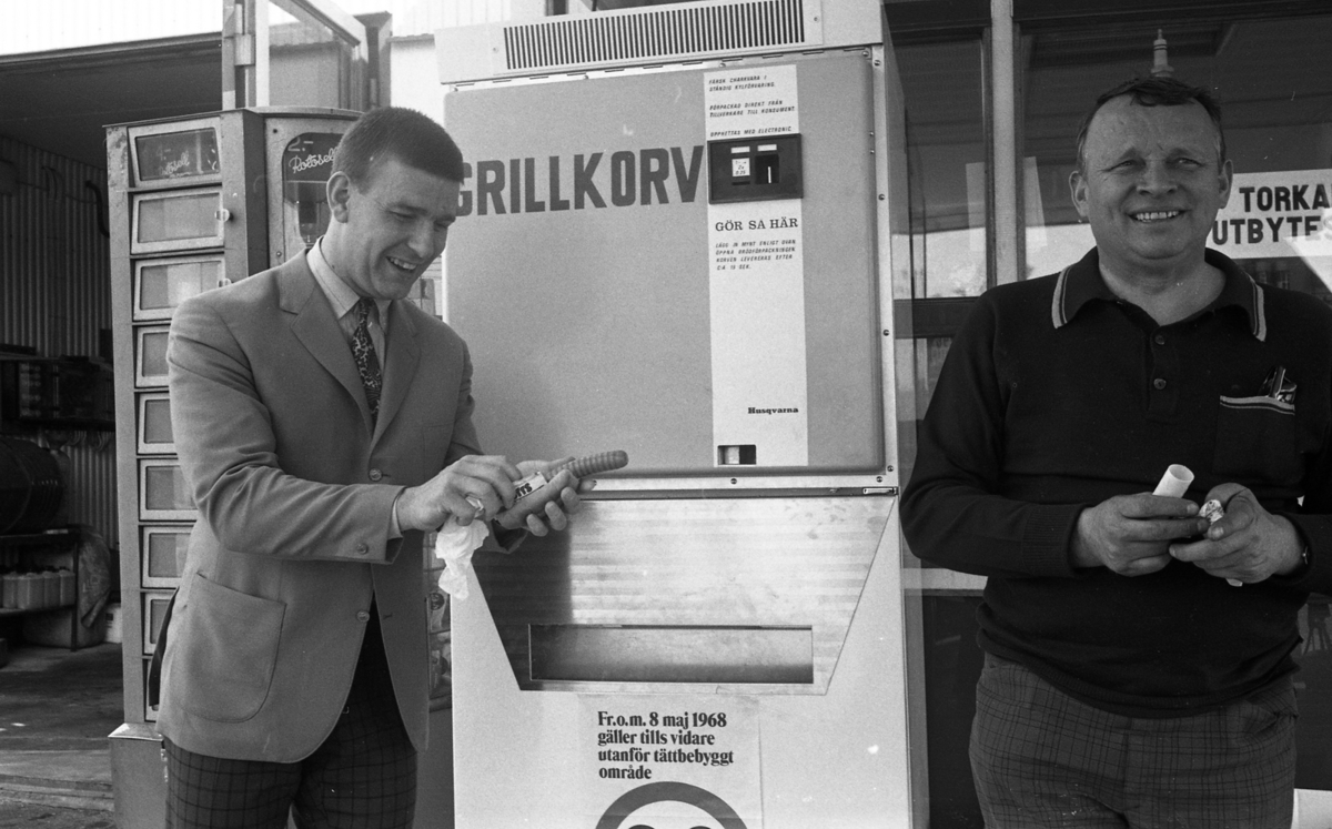 En man står och håller i en grillkorv som han precis har köpt i en automat. Han är klädd i ljus kavaj, ljus skjorta, mönstrad slips och mörka byxor. Bredvid honom står en man i mörk tröja och ljusa byxor. Han håller något i sina händer.