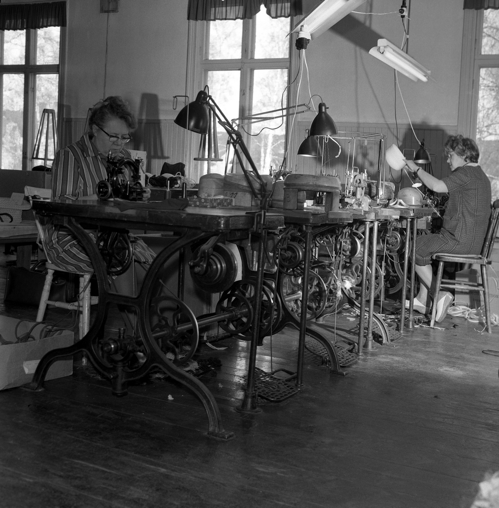 Hattillverkning. 229/67 Stråflätorna sys ihop i sysalen, i bakgrunden en härvel att linda stråflätorna på.