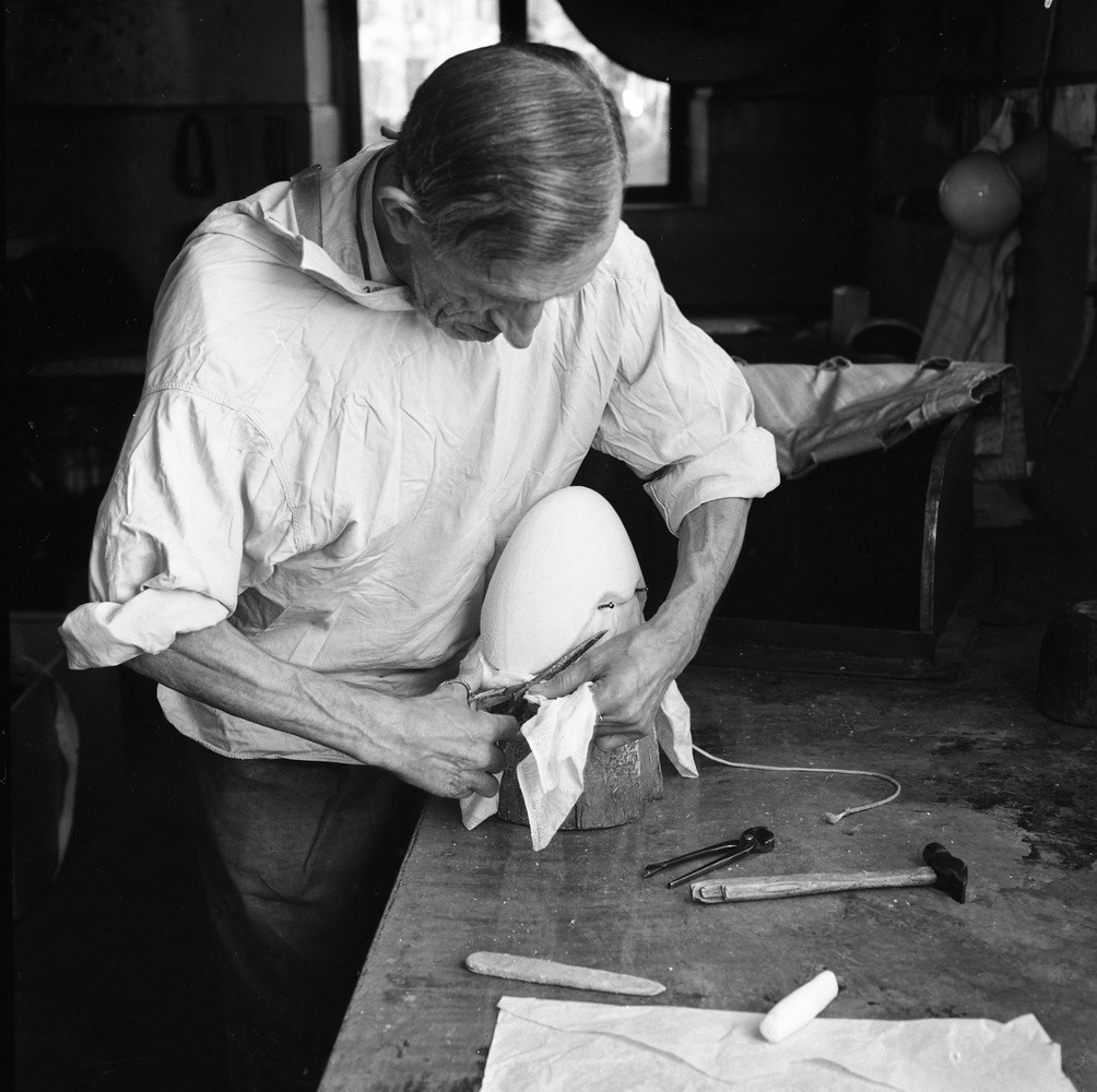 Hattillverkning. 212/67 Med en sax klippes allt överflödigt tyg bort.
