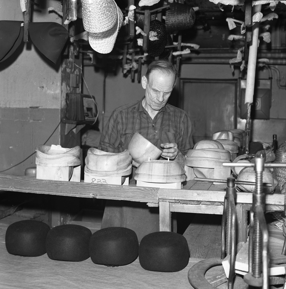 Lindbergs Strå- och Filth. Hattillverkning. 216/67 Stumpar på spassfåglar hänger i taket, fyra svarta hattar utan brätten så kallad mössor i förgrunden. I bildens centrum olika träformar. I förgrunden till höger tvingar.