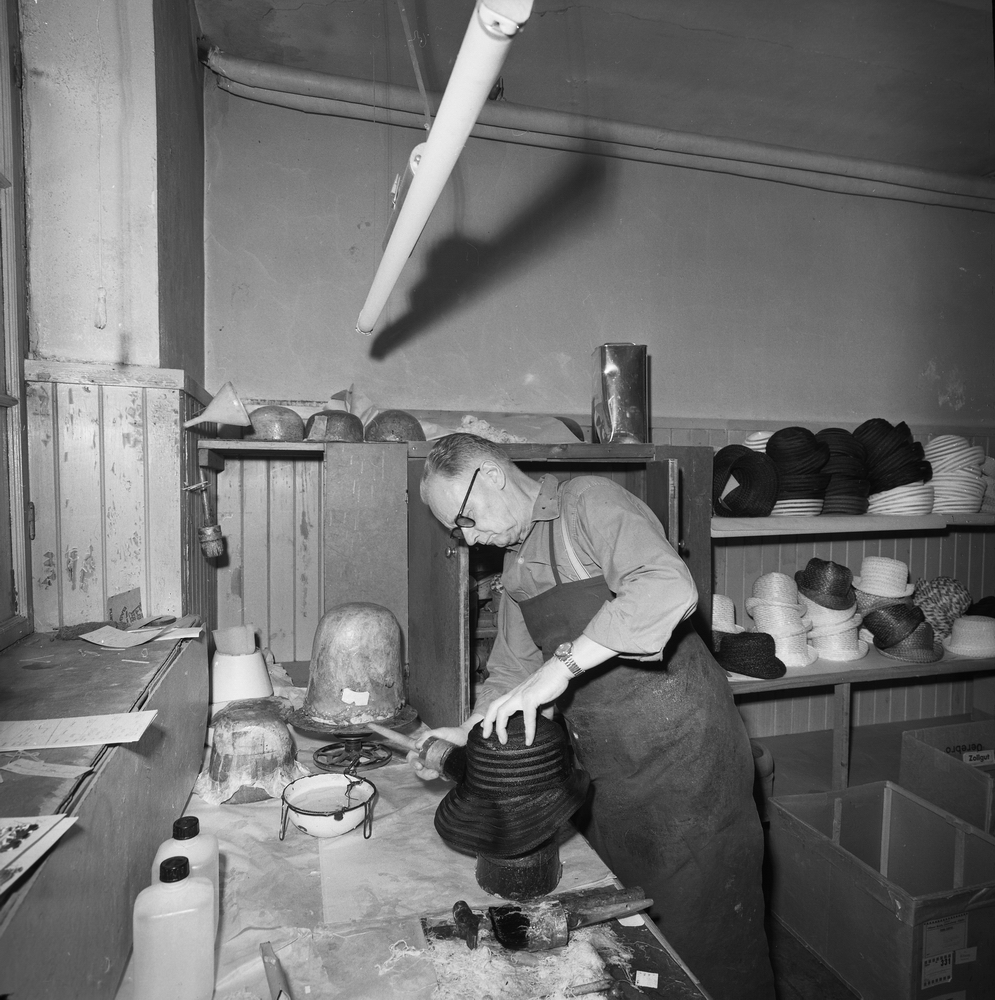 Lindbergs Strå- och Filth. Hattillverkning. 201/67 Formning av stråhatt.Med en pensel indrängt med en lösning av sprit och schellack bestrykes hatten in- och utvändigt.