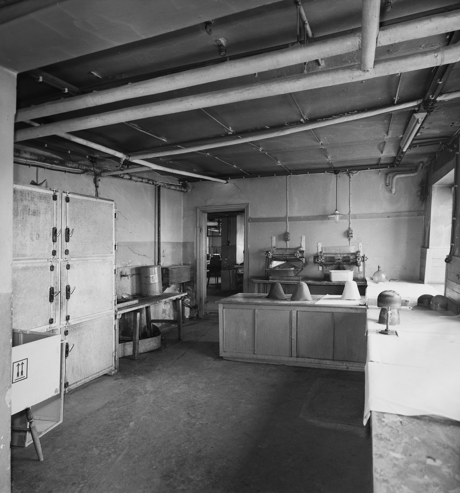 Lindbergs Strå- och Filth. Hattillverkning. 226/67 Stumparna behandlas i detta rum med apperetur och valsas genom vridmaskinerna (i fonden). Torkskåp för färdigputsade hattar till vänster.