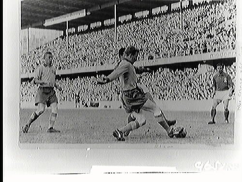 Orvar Bergmark slår bort bollen i landskamp på Nep stadion, Ungern inför 50000 åskådare.Sverige-Ungern Resultat 2-2.