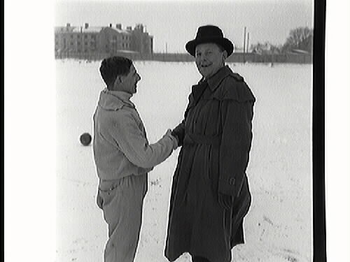 ÖSK:s fotbollsledare Gösta Pettersson talar med den kände landslagstränare Georg Rainer som Orvar Bergmark hade som tränare många år.