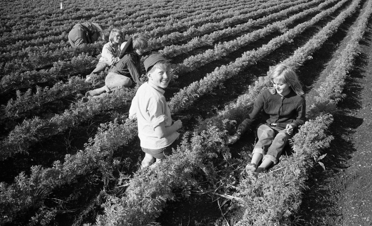 Fem tonåringar jobbar på morotsodlingen ute på ett åkerfält.