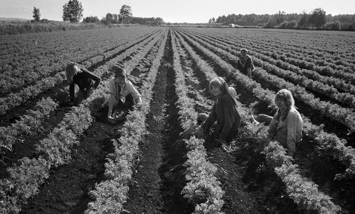 Fem tonåringar jobbar på morotsodlingen ute på ett åkerfält.