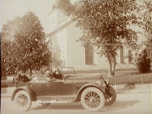 Exteriör. Bil med Ellen Larsson vid ratten, Herr o fru Larsson som medresenärer. I bakgrunden Lindesbergs kyrka.