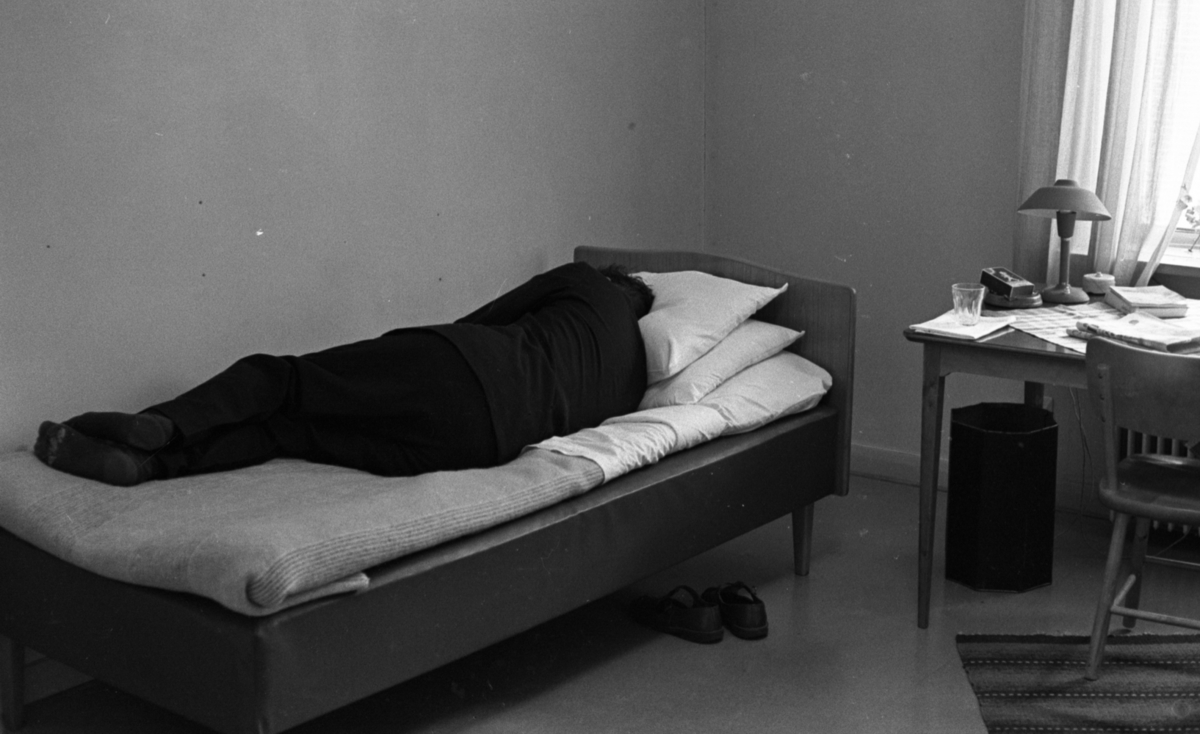 Man ligger på säng för tillnyktring i möblerat rum.