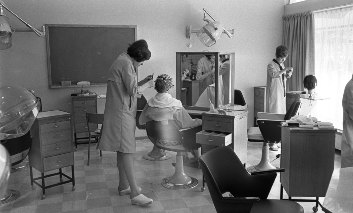 En hårfrisörskeelev kammar en äldre dam och rullar upp hennes hår på papiljotter. Den äldre damen sitter framför en spegel. Eleven har arbetsrock på sig och den äldre damen bär skyddsförkläde. Sex stycken skåp med lådor står utplacerade i lokalen, några stolar liksom torkhuvar. I bakgrunden står en annan elev i arbetsrock. På väggen hänger en skrivtavla.