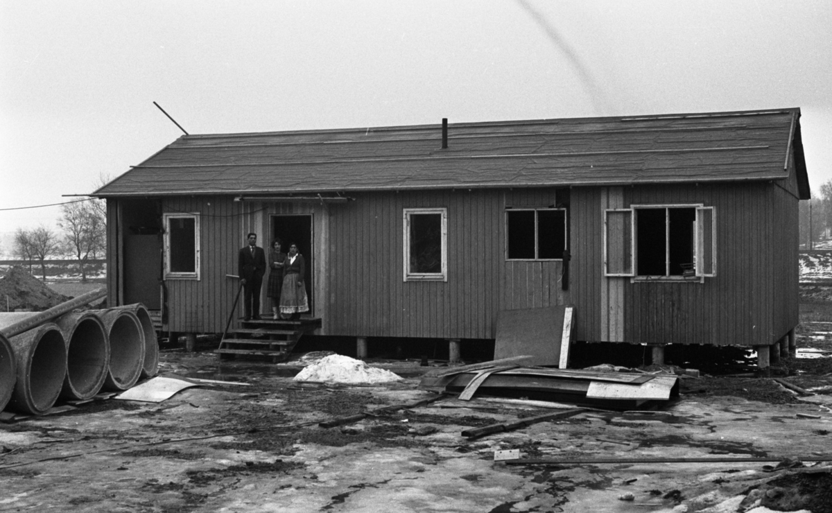 En man och två kvinnor vid ett undermåligt hus.