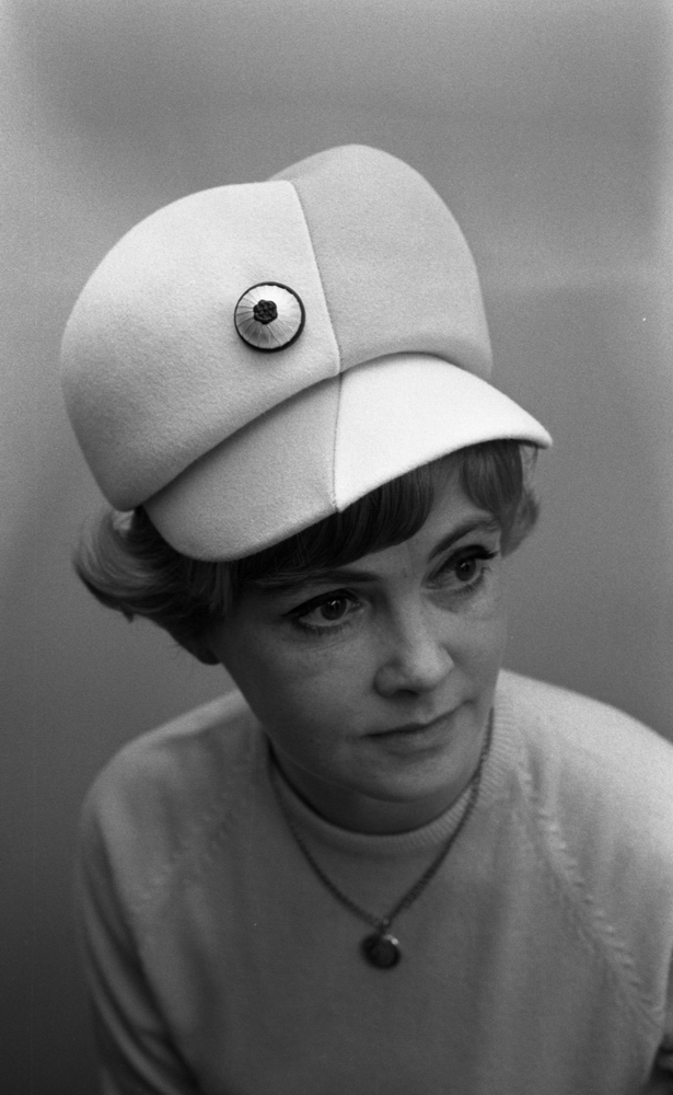 En kvinna med kort hår har en vit hatt med ett runt märke på på sitt huvud. I mitten av märket syns en svart prick. Hon bär även ett halsband runt halsen. Hon är klädd i en vit tröja.