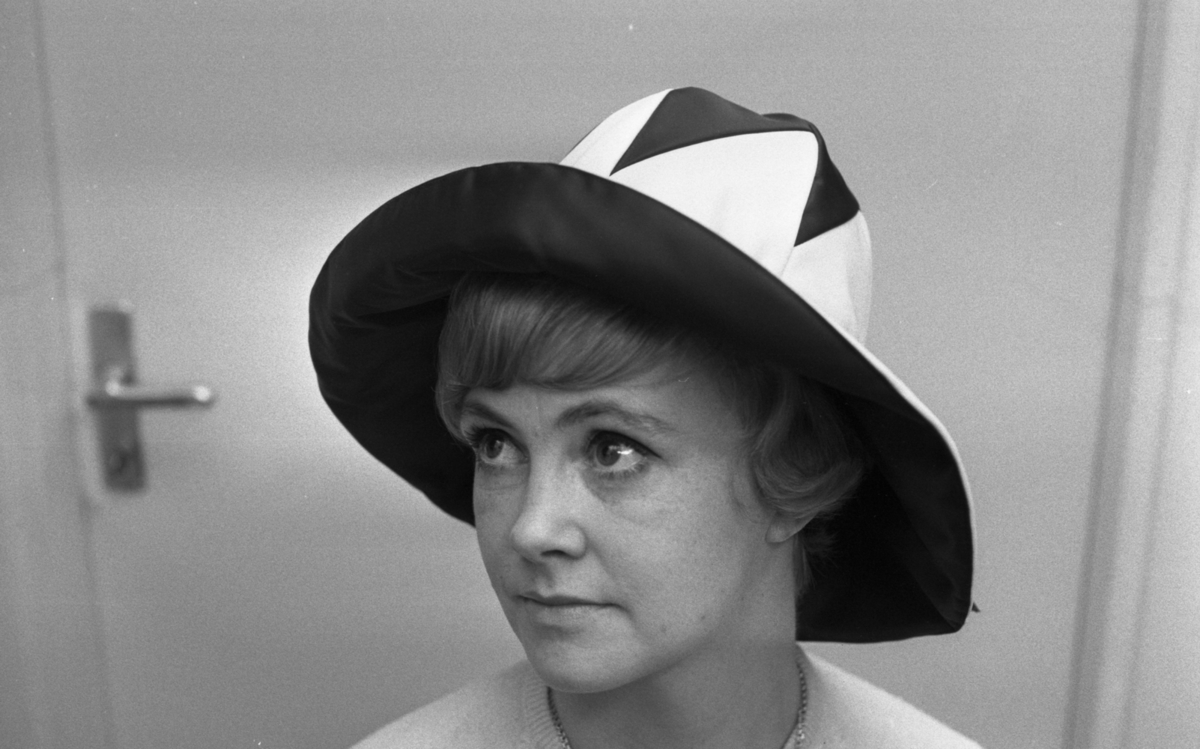 En kvinna i svartvit hatt, vit tröja samt halsband. Hon har kortklippt hår.
