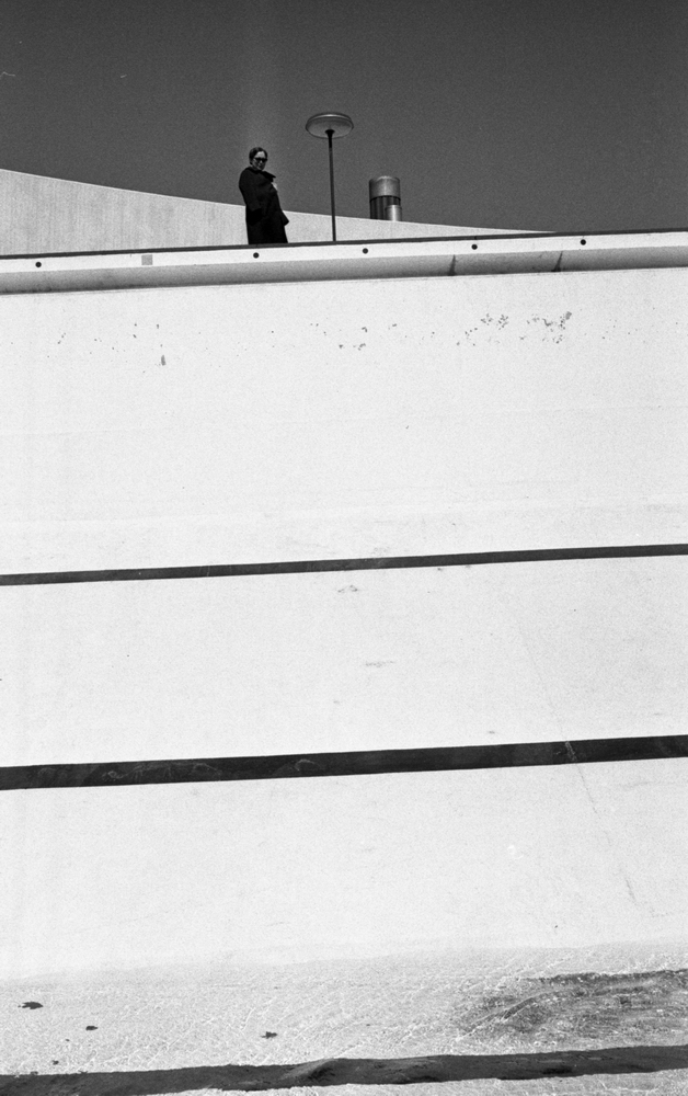En kvinna i kappa och glasögon står uppe på bassängkanten på Gustavsviksbadet. En lyktstolpe med lampa på syns i bakgrunden.
