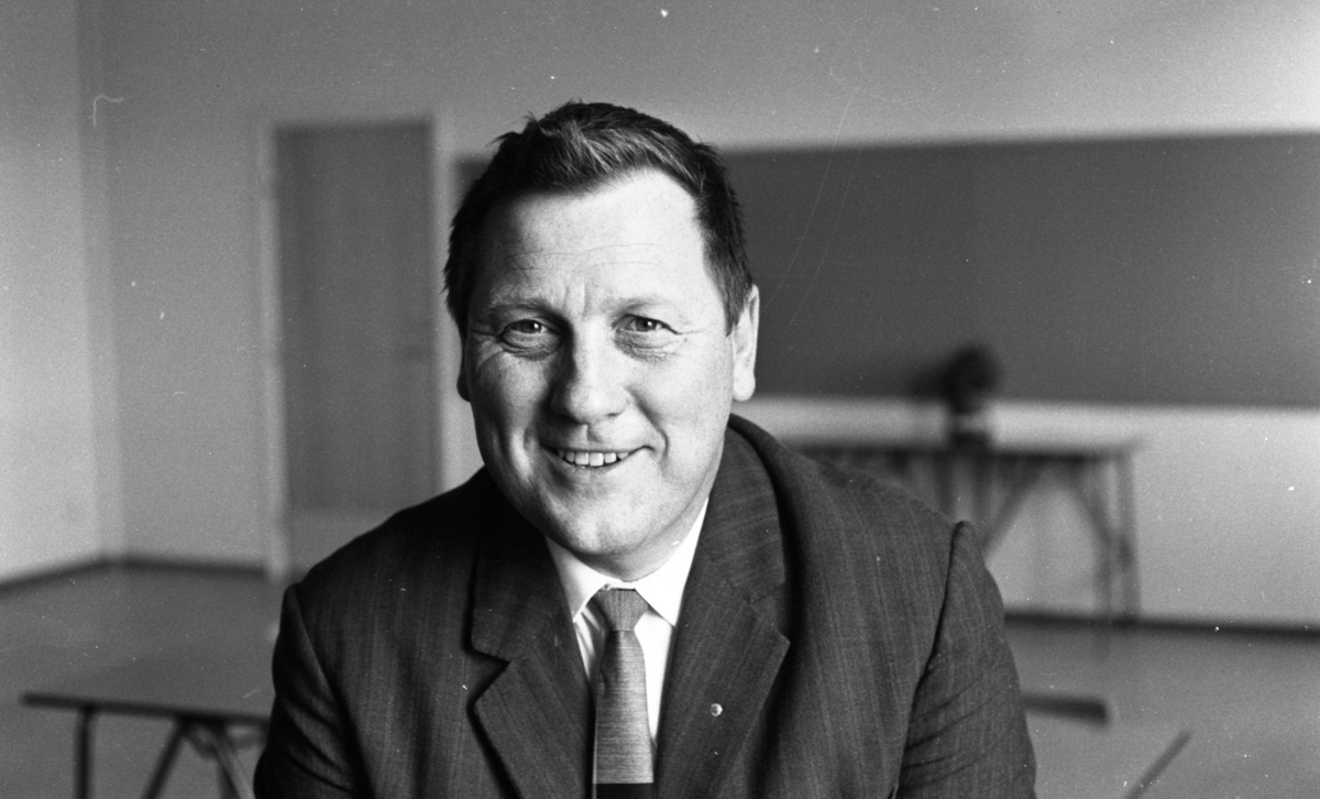 Närbild på dragspelsmusikern Gnesta-Kalle i mörkrandig kostym, vit skjorta och ljusrandig slips. Han ler mot kameran. Han sitter inne i ett rum.