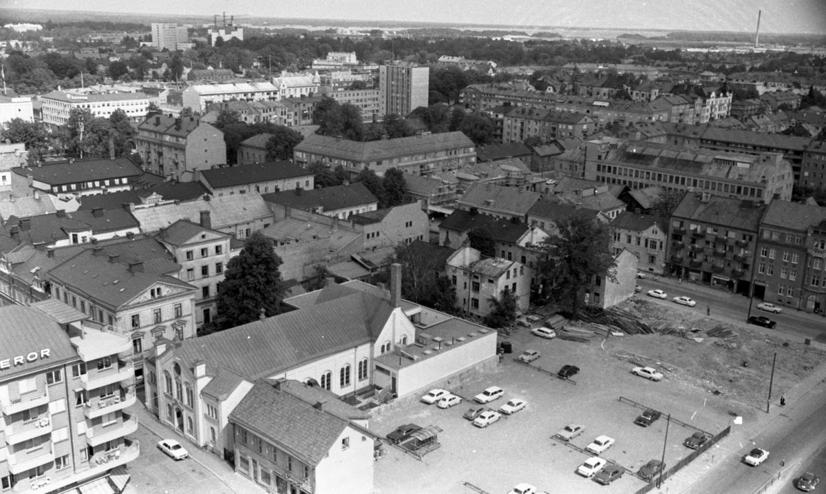 Närmast syns kvarteret Vågen där Åhlens bygger sitt varuhus 1978. Allra närmast Betelkyrkan, till höger om den f.d. bostaden för Johan Behrn med familj, Köpmangatan.