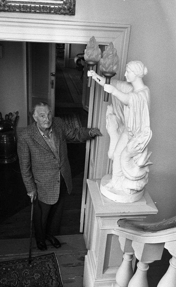 I trapphallen på Karlslunds herrgård står en äldre herre i dörröppningen. Han är klädd i rutig kavaj, rutig skjorta, mörka byxor och mörka skor samt håller en käpp i sin högra hand. Sin vänstra hand stödjer han på dörrposten. En vit staty i antik grekisk stil håller två lampor i sina händer. den sitter på en sockel i början av trappan som leder upp tilll en annan våning.