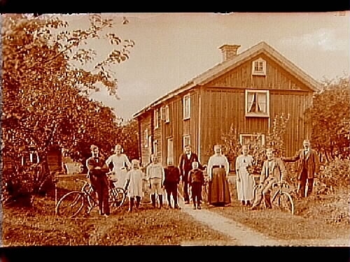 Tvåvånings timrad bostadshus, knuttimrad flygelbyggnad, familjegrupp 11 personer framför huset.