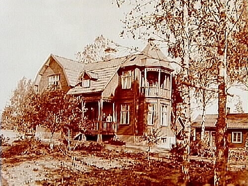 En och en halvvånings vinkelbyggd bostadshus med stor veranda, tillbyggt torn med veranda, brutet tak, takhuv. 2 personer på verandan.