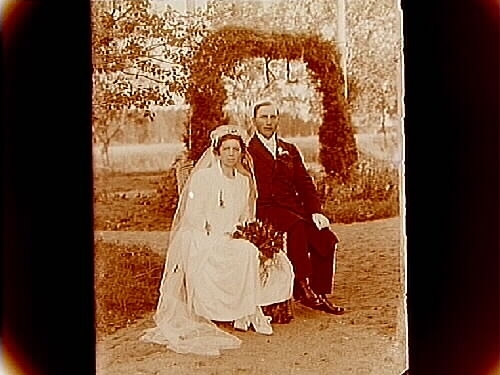Brudpar, bruden helt i vitt med lång slöja, brudgummen i bonjour.