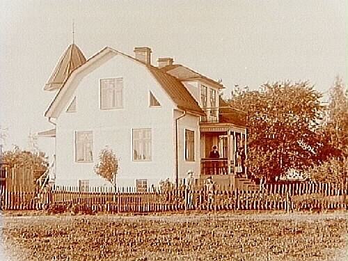 En och en halvvånings bostadshus med frontespis, torn med tornhuv, balkong, förstekvist, förstuga, köksingång.