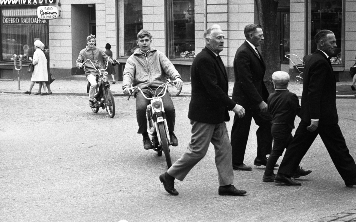 Två unga pojkar åker på mopeder på en gata i centrala Örebro. Framför dem passerar precis tre vuxna män och en liten pojke i mörka kläder. Tre damer syns i bakgrunden. De är klädda i kappor med hattar på huvudet. En barnvagn samt två parkeringsautomater syns i bakgrunden.