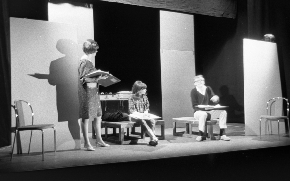 Tre skådespelare: två kvinnor och en man agerar på en scen.