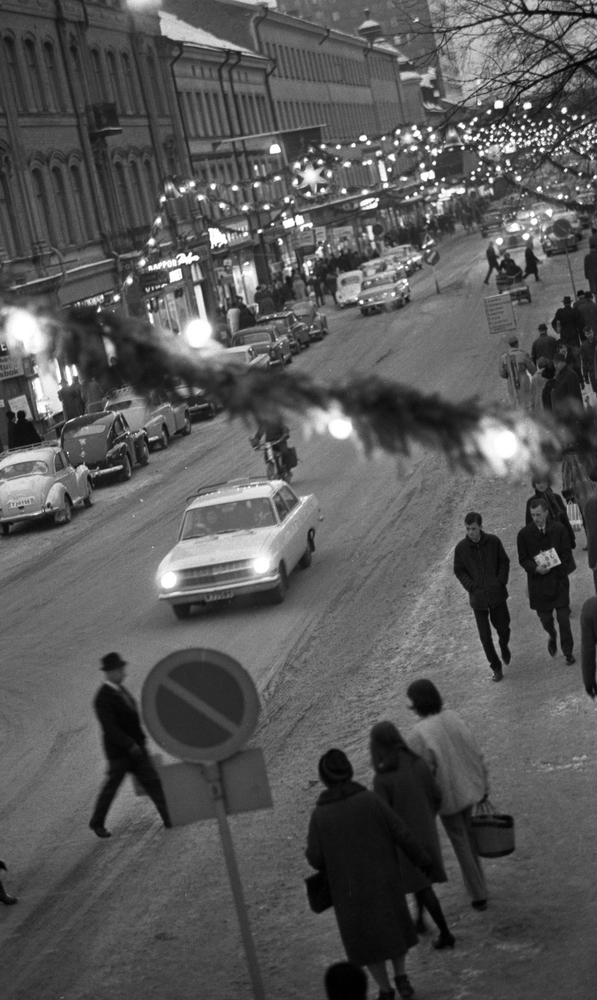 Jultrafik på Drottningatan upp mot Krämaren och livlig gångtrafik. Den snötäckta gatan är dekorerad med girlanger av granris och lampor tvärsöver. I girlangerna hänger också belysta gula stjärnor och röda klockor.