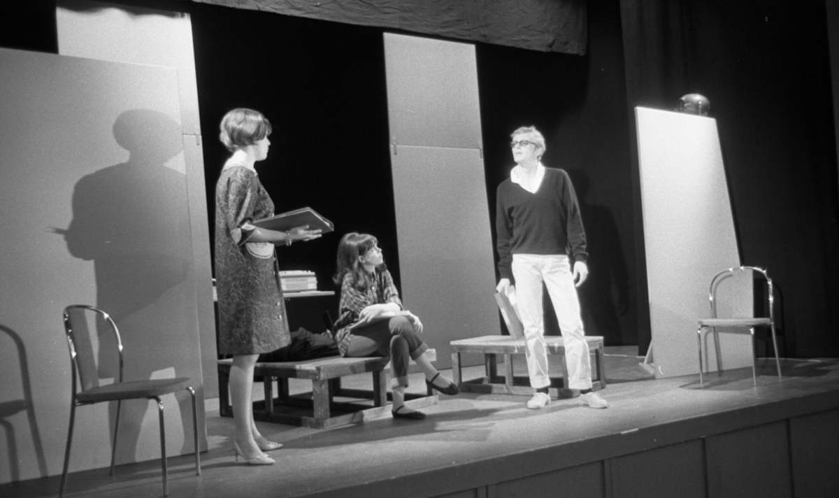 Tre skådespelare: två kvinnor och en man agerar på en scen.
