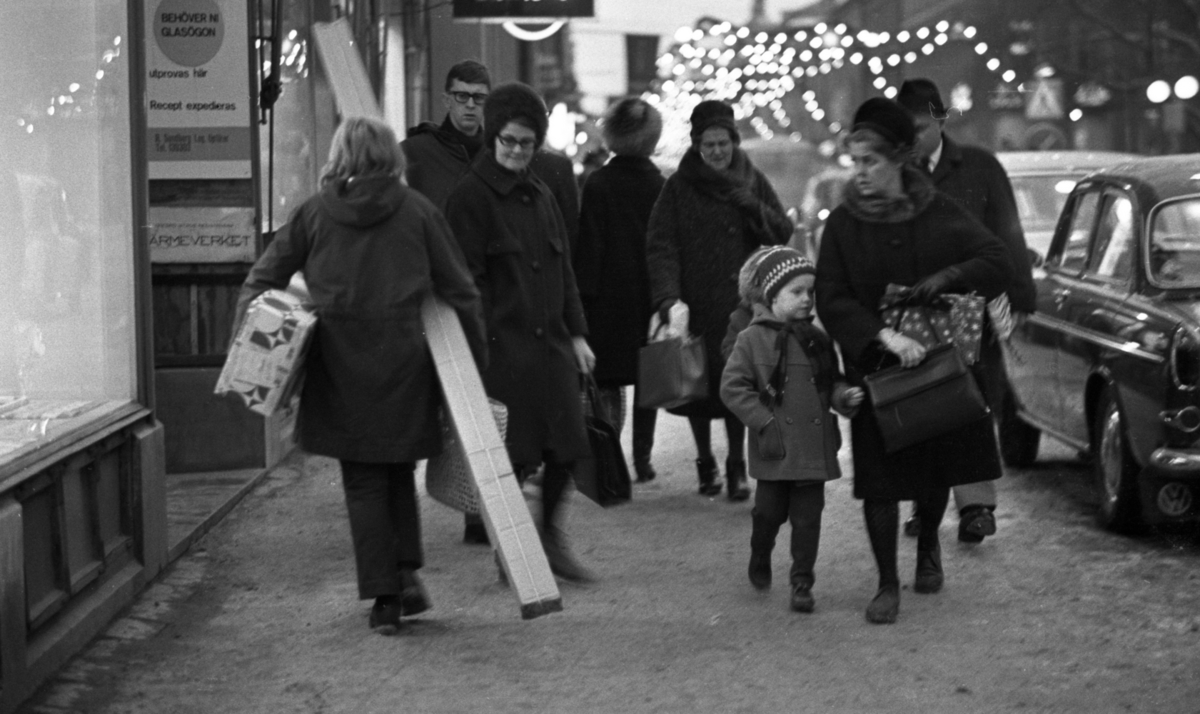 En kvinna går på den folkfyllda trottoaren med flera stora paket, bl. a. ett långt som troligen innehåller skidor.