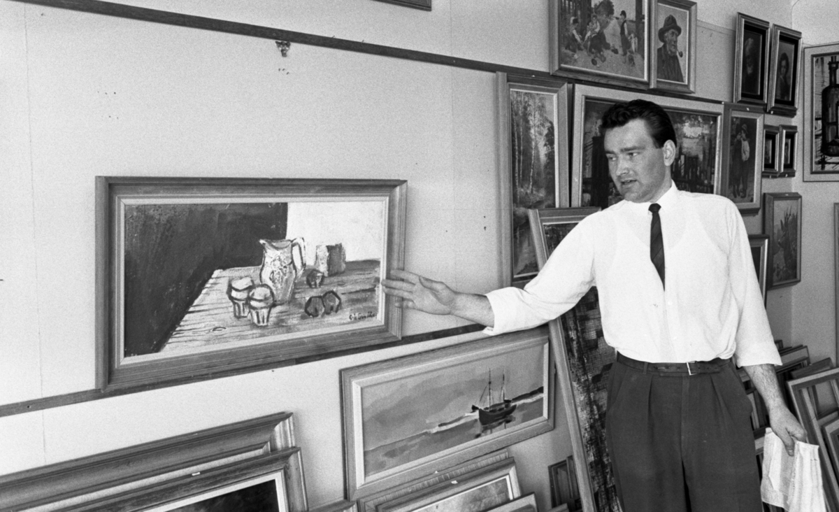 Man som håller i ett pappersblock och en penna, står vid tavla och förevisar med handen en tavla med stillebenmotiv
