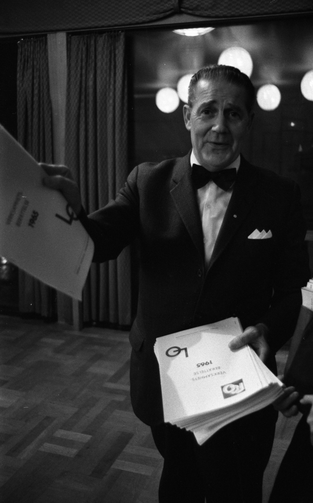 Medelålders man i kostym och fluga, delar ut häften med texten TCO LO 1965 på framsidan