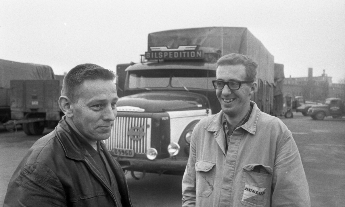 Två män i arbetskläder poserar vid lastbil, på lastbilen en skylt med texten Bilspedition
