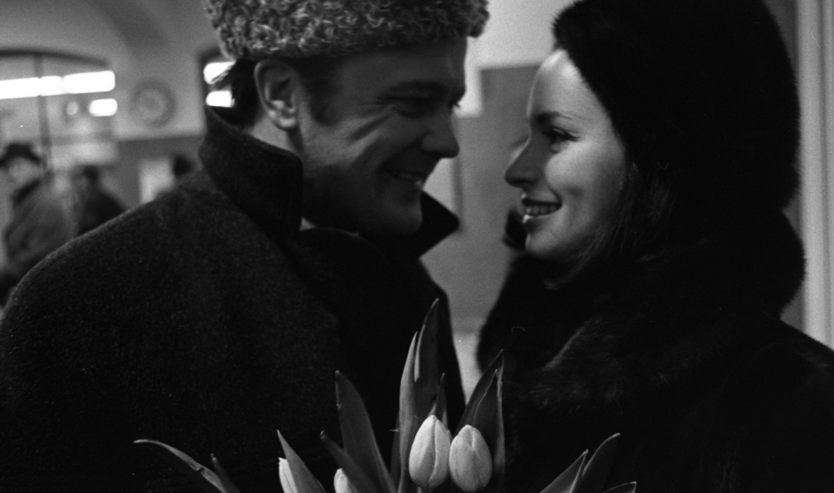 I förgrunden syns skådespelaren Gunnar Hellström och en kvinna som är klädda i pälsmössor. Han är klädd i vinterrock och hon har pälskappa på sig. Framför dem syns en bukett tulpaner. De befinner sig på Örebro järnvägsstation.