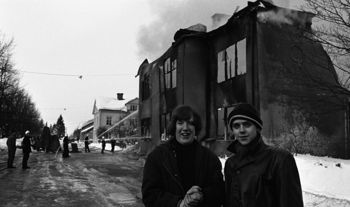 Det brinner i en skola i Nora en vinterdag. Uniformerade brandmän med brandhjälmar till riktar brandsprutornas vattenstrålar mot skolbyggnadens fasad. Det syns rökutveckling på skoltaket. I förgrunden står två skolelever.