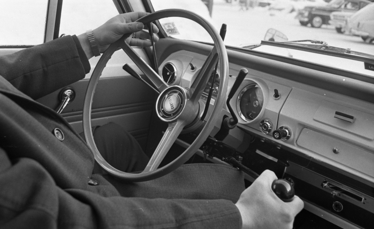 På bilden syns det handikappanpassad styrutrustning på en invalidbil. Styrhjulets nav är märkt med "Cortina".