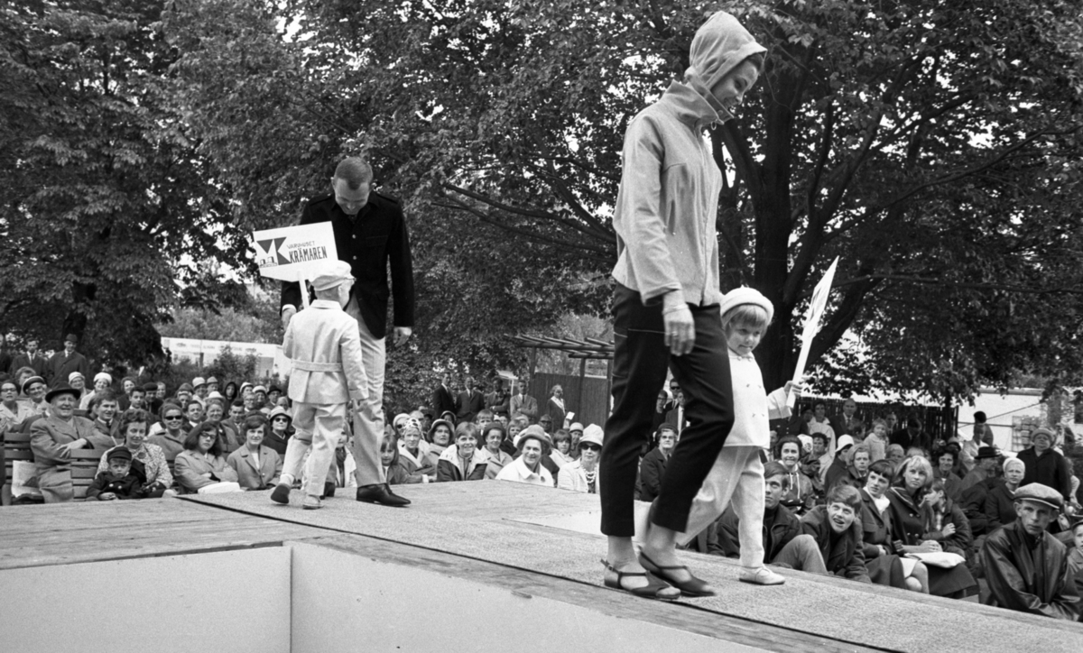 Modevisning av kläder. En kvinnlig modell, en manlig modell samt en flick- och pojkmodell. Visar kläder från varuhuset Krämaren.