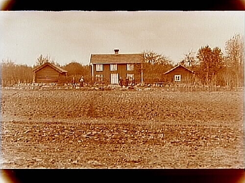 Tvåvånings bostadshus med två flygelbyggnader, 5 personer på vägen framför byggnaderna.