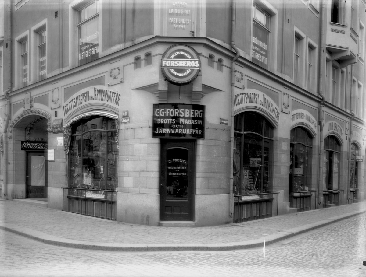 Exteriör av Forsbergs Idrotts-magasin och Järnvaruaffär.