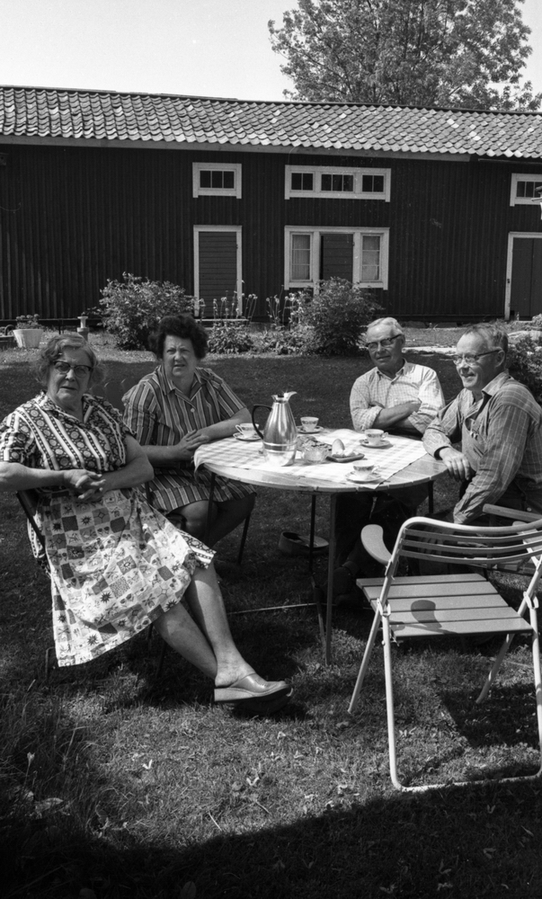 Två äldre damer och två äldre herrar sitter vid ett dukar runt litet bord utomhus och dricker kaffe i Lekeberg. Damerna är klädda i korta klänningar och en av dem har även ett förkläde på sig och herrarna är klädda i skjortor och byxor. Bordet är dukat med kaffekanna, kaffekoppar, bullfat etc. Ett stort hus syns i bakgrunden.