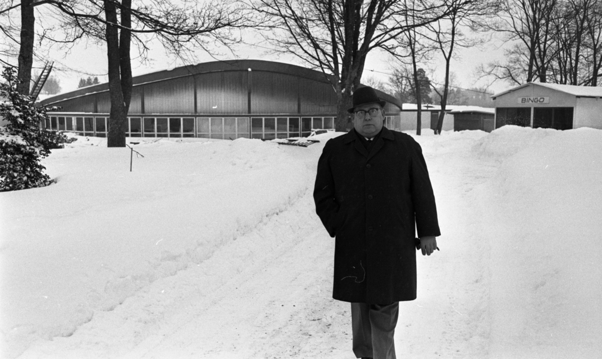 Calle Eriksson kommer gående en vinterdag klädd i mörk hatt, mörk rock, ljusa byxor samt med mörka handskar i sin vänstra hand. I bakgrunden syns två byggnader. På den till höger står det "Bingo."