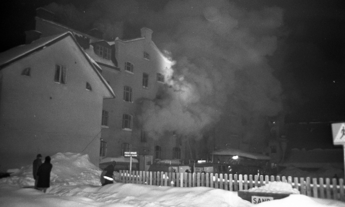 Ett hus brinner en vinternatt i februari. Rök väller ut ur en byggnad. Tre personer står på marken i förgrunden och betraktar scenariot. Det ligger fullt med snö på marken.