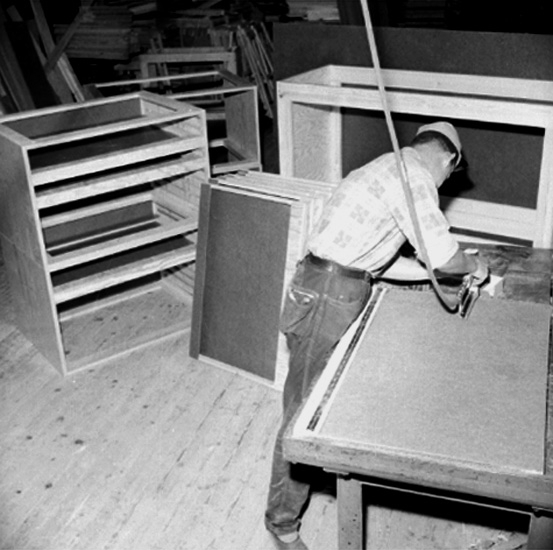 Carlsfors (Karlsfors) snickerifabrik, interiör, en man.